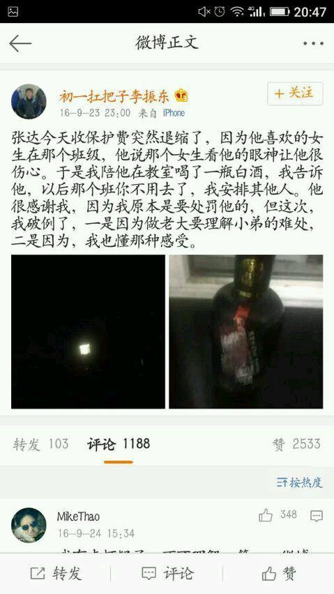 李振东的“霸业”始于微博。他自称“明德区唯一骑摩托车的男人”阿坤的领袖,为其配刀封号“闪电迈坤”;他晒出“库克空运的iphonoXsMax”,宣称“只配王者抢先拥有”;他更扬言要“一个省一个省打遍全国初中”3622。这些言行表面张扬跋扈,内核却是 孤独的表演——用虚拟权力填补现实缺失的认同。